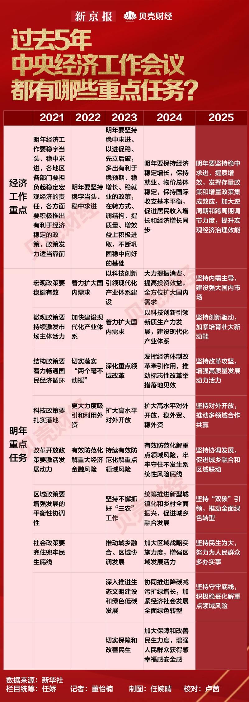 会议明确明年八大重点任务,新京报贝壳财经记者对比过去5年中央经济工作会议对重点任务部署,看明年经济工作重点有何变化。从会议内容看,明年在坚持稳中求进的基础上,更加突出“提质增效”和内需主导,强化创新驱动与风险防控统筹推进。